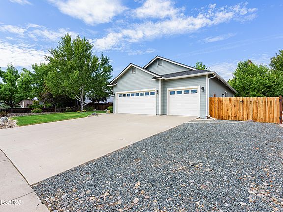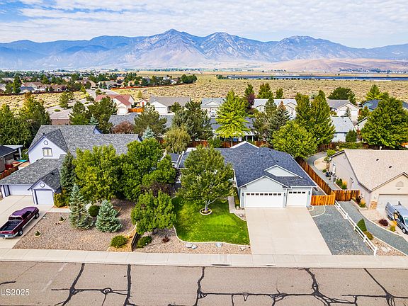 WELCOME HOME to this immaculately maintained single level home in the highly sought after Saratoga Springs Community of Minden! Enjoy majestic Sierra Nevada mountain views and a prime location in the heart of the Carson Valley. This move-in ready home features an open-concept layout with a desirable split floor plan and thoughtful upgrades throughout. Inside, you'll find luxury vinyl plank flooring, nine-foot ceilings expanding to vaulted ceilings throughout, vinyl Milgard windows, custom maple cabinets, new can lighting, ceiling fans in every room, a whole-house humidifier, newer AC and furnace, and a new thermostat to enhance comfort and convenience. Washer, dryer, and refrigerator are also included! The living room boasts vaulted ceilings, a cozy gas fireplace, and flows seamlessly into the kitchen and dining area, perfect for entertaining. The kitchen is a chef's delight, offering granite slab countertops, beautiful maple cabinets with custom pullouts, stainless steel appliances, double ovens, new can lighting, and a full breakfast bar with ample seating. The dining area features elevated windows framing the breathtaking mountain views, and access to the backyard patio for your dining preference. The primary suite captures the serene backyard and mountain vistas. The spa-like primary bath includes a dual vanity, separate water closet, a brand new freestanding soaking tub, separate shower, and a large walk-in closet designed with a full custom organization system. Outside, enjoy RV parking, mature trees, and fully landscaped front and back yards. A west-facing fully fenced backyard with a large covered pergola offers privacy and stunning sunset views. Full gutters with leaf guards add low-maintenance convenience. Adventure awaits just steps away, from the Saratoga Springs Community Park to nearby BLM land in the Pinenut Mountains. Hike and bike in the Sierra Nevada Mountain ranges, enjoy Lake Tahoe's beaches and boating, or hit the numerous world-class ski resorts. The Reno-Tahoe International Airport is just a short drive away. Don't miss this opportunity to make this stunning home YOUR private oasis here in the Carson Valley today!