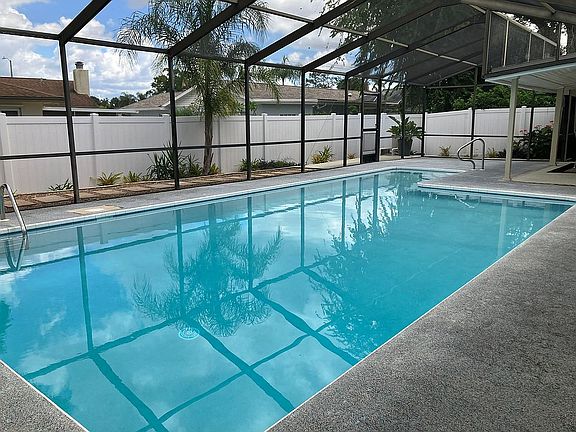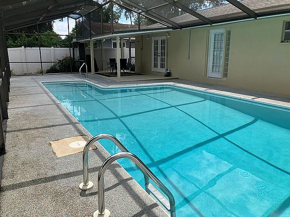 Attractive corner lot; nicely landscaped. No Flood Zone; located in Wilshire Est; unincor area of Dunedin; convenient to schools/shopping. Attached in-gr pool; screen encl; newly resurfaced pool plus new filter sys. Covered patio w/table, chairs, gas grill. Patio stone wlkwys to pool (E and S sides). Dbl car garage w/auto door opener; garage door hurricane rated; ovrhd storage area w/dropdown ladder. Washer/dryer hookups. 52 Gal quik-rcry wtr htr still under warranty. Central heat/air; Honeywell programmable thermostat. 8' vinyl fence provides complete privacy from adj properties. Shallow well irr sys w/auto timer. Concrete drvwy. Kitchen-24 cu ft stainless LG refrig/freez (purch new 9/2023). Frigidaire stainless elec range w/self-clean oven (purch new 5/21) still under warranty. Stainless exhaust hood; dishwasher; microwave; stainless dbl-sink w/disposal; Concealed lighting; Generous Cabinet space; Ceramic Tile bckbrds. Bedrooms-All have generous closet space with walk-in closet in MBR. MBR and BR#1 have exit doors to pool, as well as family room. Main Bath-Tub and shower; vanity cabinet storage; recessed lighting; ceramic tile thru-out. Master Bath-large walk-in shower; wall closet; ceramic tile thru-out; commode has all new parts. Living Room-Lrg L-shaped room with book shelves and 3 exterior windows. Other Features-Low maint ceramic tile flooring thru-out. Ceiling fans thru-out; smoke detectors thru-out; venetian/vertical blinds thru-out; dimmable lighting thru-out