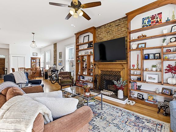 * living room has a working fireplace flanked by floor to ceiling (10ft!) bookcases, ample room for unwinding after a long day