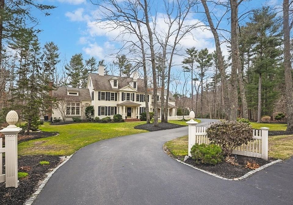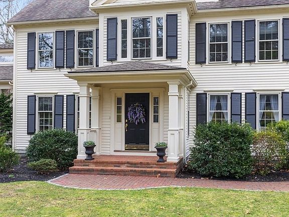 This beautiful colonial is impeccably positioned on a lush flat lot, with winding drive, welcoming farmer's porch and immeasurable curb appeal. A spacious and inviting home, offering an open floor plan ideal for entertaining and modern family living. You'll be greeted by a grand 2 story entrance flanked by elegant living and dining space - opening to this delightful eat-in kitchen with top of the line stainless steel appliances, cherry cabinets, granite counters and pantry. The highlight on this level is the family room with cathedral ceiling, gas fireplace, and french doors leading to private back yard with luxurious plantings and thoughtfully designed deck & patio. Four generous bedrooms on upper level including vaulted primary suite with 2 walk-in closets, and a marble bath with heated floors, double sinks, soaking tub and rain shower. Looking for additional space? The finished third floor could make the perfect office, playroom or in-law suite. You don't want to miss this one!