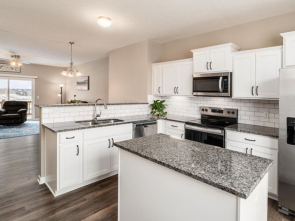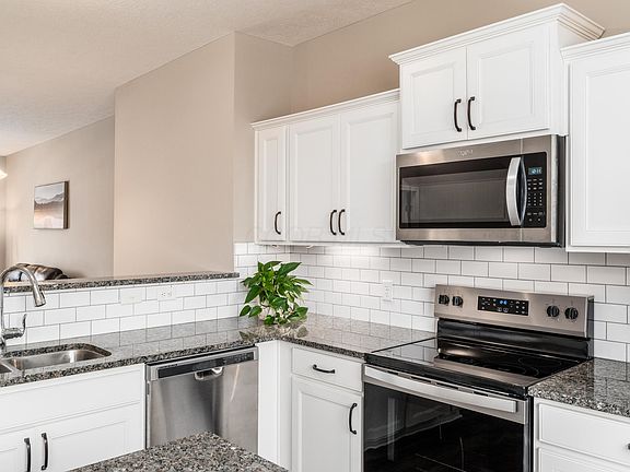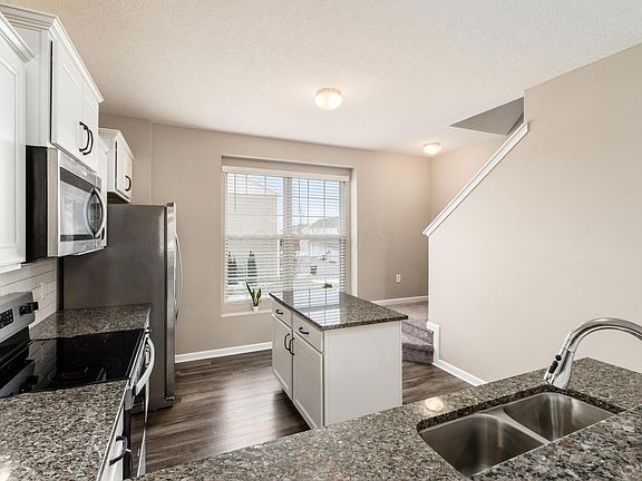 This multi-level loft features a modern kitchen with stainless steel appliances, granite countertops, a beveled ceramic backsplash, and an island. It opens to the dining and living areas, leading to a private back deck. The home offers dual owner's suites with full baths and convenient same-level laundry. The street level includes a family room/office and one-car attached garage. Upgrades include plush carpeting, fresh wall colors, and LVT flooring in the kitchen, foyer, dining, living room, and half bath, with vinyl in the full baths.