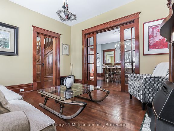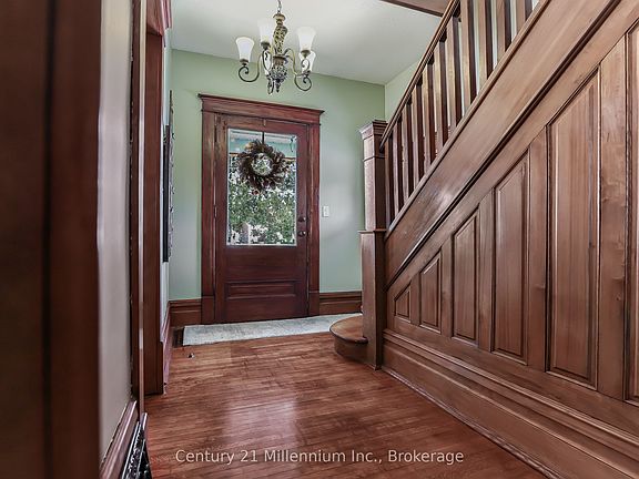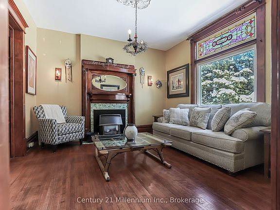 This Victorian estate is a timeless masterpiece. Storied to once be home to a local doctor, this Chatsworth treasure seamlessly blends old-world charm with modern comforts on a private double-wide lot. The stunning double-brick exterior, wraparound veranda, and grand 42-inch solid wood front door make a striking first impression. Inside, intricate woodwork, original hardwood floors, stained glass and transom windows, a Juliet balcony, wide entryways, and soaring ceilings elevate the grandeur. Meticulously preserved, this home showcases the craftsmanship of its era while incorporating thoughtful updates for contemporary living. The formal dining room is perfect for entertaining, while the cozy living room, with its historic fireplace and natural gas insert, invites relaxation. A decorative staircase leads to the second floor, where three spacious bedrooms feature oversized windows and doors. This level also includes a dedicated laundry room and a modern 3-piece bath with an extra large stand-up shower. The third-floor suite is a private retreat, lined with warm cedar plank walls and insulated with Roxul for year-round comfort. A 2-piece bath completes this tranquil escape. Descending the historic butlers staircase, you arrive in the beautifully updated kitchen. Cherry cabinetry, a centerpiece island, stainless steel appliances, and a striking black slate natural stone floor make this space both functional and stylish. A conveniently located half bath adds to its practicality. Seamlessly connected to two inviting entertaining areas, this kitchen is the heart of the home. On one side, a formal dining area sets the stage for intimate gatherings, while the other opens into a cozy living room with agas fireplace. Beyond, the four-season sunroom is a showpiece flooded with natural light and offering direct access to the backyard oasis. Completed in 2023, the in-ground pool is a true highlight, surrounded by interlocking stone, a fire pit, and a Mennonite-style pool house.