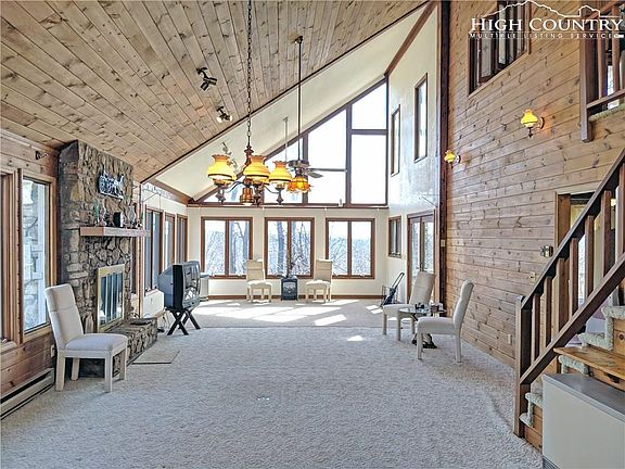 Long Range Mountain views,a 180 degree panorama in this amazing mountain chalet. One level living with massive open great room, 3 bedrooms 2 full baths. Built-ins in Master for ideal storage space, overhead lighting in all rooms, T&G ceilings, sturdy as a rock. The "crawl space" is begging to be finished with over 800 sq ft of floored workshop space. Gas Fireplace - was originally wood burning and could be converted back most likely. Energy efficient ETS heat system on main level. There is a chair lift installed 2007 for assisted access to second level. Home is located in the gated community of Powder Horn. POA fees are 1602 a year and include full time maintenance, security, clubhouse, pool, three lakes, campground, river access to state stocked trout streams, hiking trails, playground, chapel, tennis court, and so much more. Short term and Long term Rentals are allowed! New Roof 2000, Seamless Gutters 2002,New Carpet 2002,Gas Logs, 2005, New Toilets 2007, Garbage Disposal 2007, Stairlift 2007, Hot Water Heater 2000,New countertops and appliances 2004, addition by Billy King 2004, New Decks 2004, Window Caulking 2004,