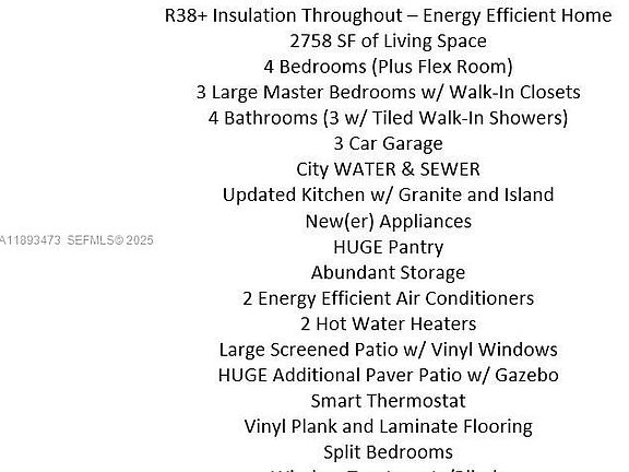 Updated & EXPANDED! Main House w/ MASSIVE ADDITION (2023)! Large OVERSIZED Lot .35 Acres! New Metal Roof! Impact Low-E Windows Throughout! R38+ Insulation - Energy Efficient! 2758 SF of Living Space! 4 Bedrooms (Plus Flex Room)! 3 Master Bedrooms w/ Walk-in Closets! 4 Bathrooms! 3 Car Garage! City WATER & SEWER! Updated Kitchen w/ Granite and Island! New(er) Appliances! HUGE Pantry! Abundant Storage! 2 Energy Efficient Air Conditioners! 2 Water Heaters! Large Screened Patio w/ Vinyl Windows! HUGE Additional Paver Patio w/ Gazebo! Boat / RV / Recreational Vehicle Storage and Access Gate! Vinyl Plank and Laminate Flooring! Split Bedrooms! Window Treatments/Blinds! Alarm & Camera System! Hot Tub! Gutters! 2 Large Sheds! NO HOA/CDD/Community Fees!