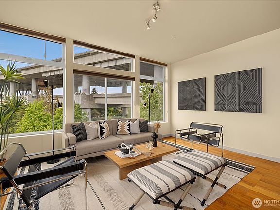 Enjoy the best of Eastlake living in this bright and modern one bedroom condo just one block from Lake Union. This top-floor corner unit features an open layout with soaring ceilings, rich hardwood floors and tons of natural light. The stylish kitchen includes stainless steel appliances, granite countertops and sleek dark cabinetry, perfect for hosting or a quiet night in. The bedroom offers a walk-in closet while the full bathroom includes an in-unit washer and dryer for added convenience. Ruby is a well-maintained, pet-friendly community that features a lush vegetable garden, a serene courtyard with breathtaking lake views and unbeatable access to neighborhood favorites, only moments to vibrant restaurants, cafés and shops.
