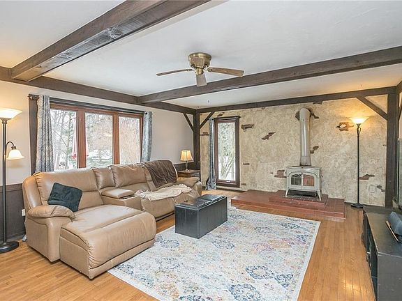 Delightful Cape Cod located on a charming wooded lot. This home is much larger than it looks from the street! Boasting rich hardwood floors, new carpet, and fresh paint throughout, this home is move in ready. As you enter into the foyer on the first floor, you are greeted into the spacious living room with a wood burner, perfect for cozying up in the winter. The open concept kitchen and dining area is perfect for entertaining friends and family. With new appliances, ample counter space, and a built in peninsula, you'll love cultivating your culinary skills in the kitchen. The first floor is finished with a half bath, and the first of three bedrooms. Two additional bedrooms are conveniently found on the second floor, along with a tastefully updated full bathroom. The basement has an extra finished room, currently being used as an office, and that would also make a great guest room, play room, or home gym. The basement is complete with storage space galore and an additional full bathroom. Newer hot water tank, along with radiant hot water/steam heat keep this home at the perfect temperature. Situated on over 2 acres, this large lot has plenty of room to run and play. This quiet oasis of a yard is the perfect spot to have a bonfire, explore the creek, and enjoy nature. A quarter acre is fenced in with an even larger perimeter of an invisible fence. One year home warranty provided by America's Preferred Home Warranty for added peace of mind. Schedule your private showing today!