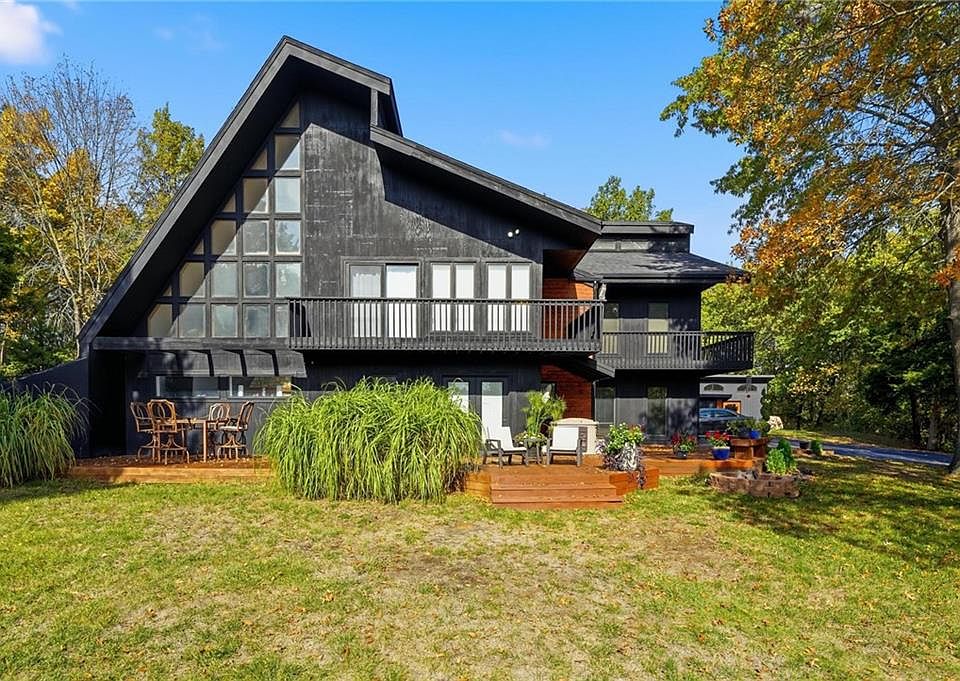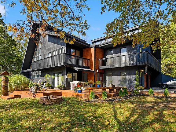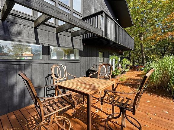 Nearly 5 acres with gorgeous updated home. Long, tree lined drive leads to a contemporary home with exceptional privacy. Natural tones on exterior finishes. Nestled in the trees, offers peace as well as great space to entertain. Large deck off main level, wrap around deck on 2nd level. Open plan, soaring ceilings, large windows provide views of nature and tons of natural light. Updated kitchen is bright & open with white cabinets, center island. Outside city limits!