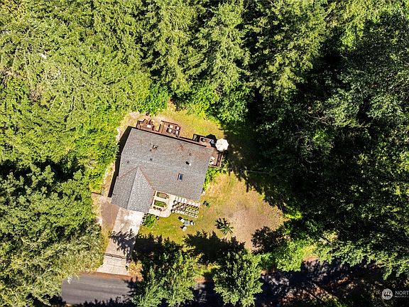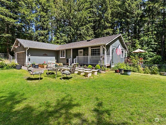 This rambler is on just over an acre, in a private setting. Enter into a living room that is open to dining room. With skylights, cathedral ceiling, updated tile surrounds the fireplace just waiting for you to enjoy the northwest weather. Hardwoods are throughout the home & bay windows bring in the outdoors. Updated light fixtures through the home just add to the cozy feel the minute you enter. French doors lead to deck to enjoy all year. Kitchen is a delight with the butcher block counters to the fun back splash. Bedrooms are all good sized & the primary bedroom is a retreat in itself to come home to. Natural landscaping surrounds you just waiting for your creative touch. Property is fully fenced.