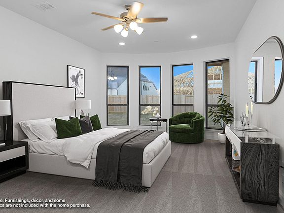 READY FOR MOVE-IN! Two-story entry highlights curved staircase. Home office and formal dining room frame entry. Kitchen and morning area open to two-story family room with corner fireplace and wall of windows. Kitchen features walk-in pantry, Butler's pantry and generous island with built-in seating space. First-floor primary suite includes bedroom with curved of wall of windows. Dual vanities, garden tub, separate glass-enclosed shower and two walk-in closets in primary bath. First-floor guest suite with private bath offers view of backyard. Upstairs highlights a media room, game room and Hollywood bath. Covered backyard patio. Mud room off three-car garage.