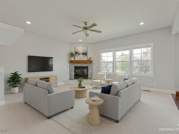 The two-story foyer sets a welcoming tone and leads into the open main level. The great room features a gas fireplace and plenty of natural light, flowing seamlessly into the eat-in kitchen. The kitchen includes upgraded countertops, a tile backsplash, stainless steel appliances, and a comfortable dining area that overlooks the backyard. Brand new carpet (installed October 2025) throughout adds a fresh touch.