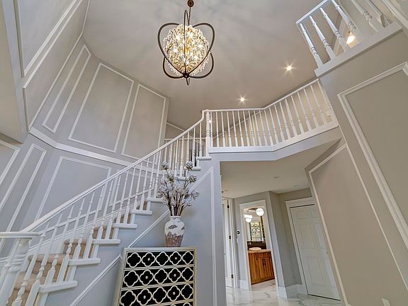 Grand foyerElegant great roomGigantic kitchen islandDouble-thick stone countertopOne-piece back splashKohler brass hardwaresDesigner lightings