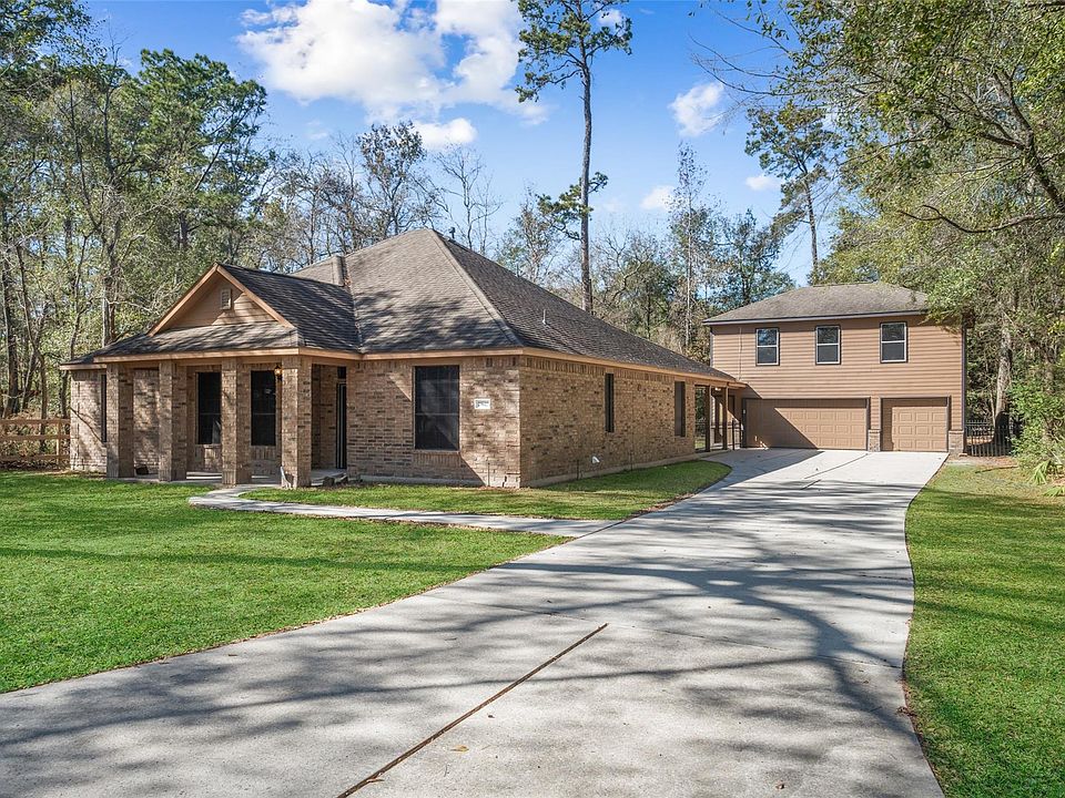 You’ll love this hidden gem on a secluded 1/2 acre, just minutes from city life and the Exxon campus! Fresh paint, new carpet, modern fixtures, and updated kitchen and bath cabinets make this one-story home perfect. The open kitchen features granite countertops and a new oven, while the primary bedroom overlooks the private back yard. The ensuite bath includes dual shower heads in the large walk-in shower. Enjoy total privacy with no neighbors on any side! Plus, there's a garage apartment with a kitchenette and full bath above the 3-car garage. Don’t miss out on this cozy retreat with all the comforts! Close to The Woodlands Waterway and easy access to I-45 and Grand Parkway.