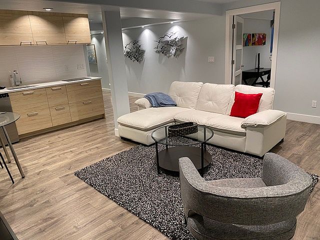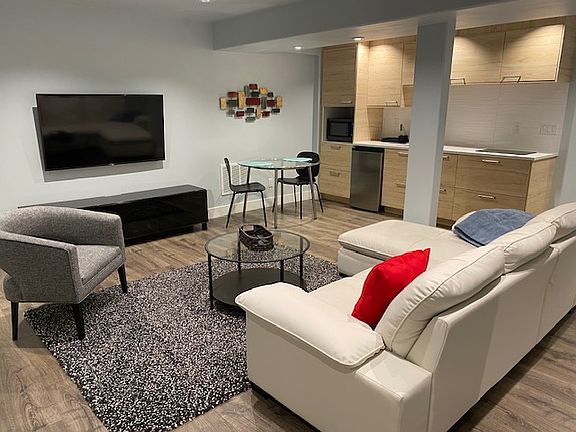 Beautiful modern, newly completed, private basement apartment in my single family home. It is completely furnished and includes one bedroom with private bathroom, a beautiful kitchenette area, and a living area with TV, dining set. INCLUDED: All furnishings, linen, kitchenware, utilities, internet, cable TV, laundry, paper product, housekeeping services. Just bring your personal items and you're ready to go!