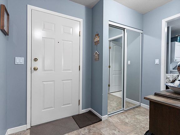 Top floor, west-facing 2 Bed + Den Condo in Bramblewoods by the Stream! Updated and move-in ready, this bright and spacious unit features a custom maple kitchen with granite countertops, stainless steel appliances and vaulted ceilings in the open-concept living area. Enjoy a natural gas fireplace (gas incl. in strata fee!) and covered deck perfect for year-round use. Primary bedroom has balcony access and a beautifully updated ensuite with separate tub/shower. Second bath also fully updated. Bonus den, oversized laundry/storage room and a storage locker in the underground area. Quiet 55+ building with a small pet allowed. Prime central location on a cul-de-sac—steps to Horn Creek Nature Path, Mill Lake and shopping. This condo offers downtown convenience without the noise!