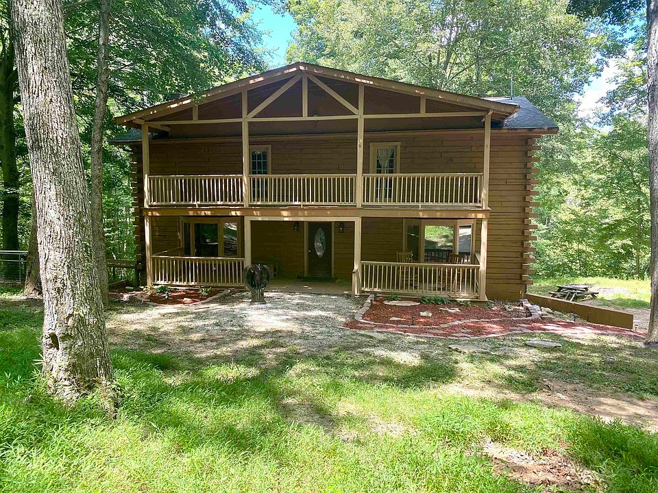 Tranquility and privacy await you at this beautiful, Amish built home. Step inside to a grand foyer where you will find natural wood walls and fresh new flooring. The living space offers ample space and a beautiful stone, woodburning fireplace as well as new flooring. The kitchen is large with plenty of room for a full-sized table. The first floor also offers a formal dining room that could be used as an office or playroom as well, and a full bathroom. Upstairs you will find a massive primary bedroom with balcony access. The bathroom has new flooring and a large garden tub perfect for relaxation. Two more bedrooms, one of which has balcony access, finish out the top level. This home also offers a basement that includes a kitchenette and full bathroom as well as access to the two-car garage. Situated on nearly 7 acres, this home offers lovely view of the Blue River as well as plenty of space to enjoy nature. There is even a fenced, pastured area for animals! Home Warranty included!