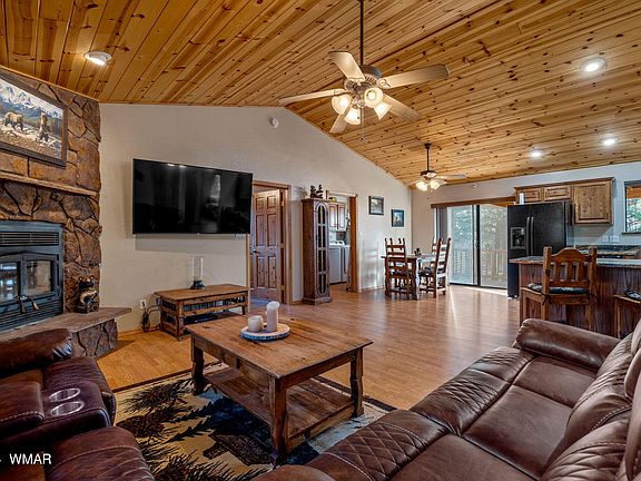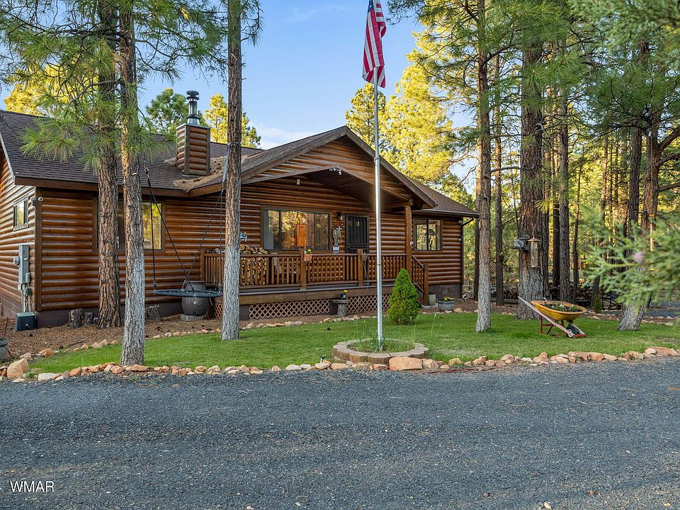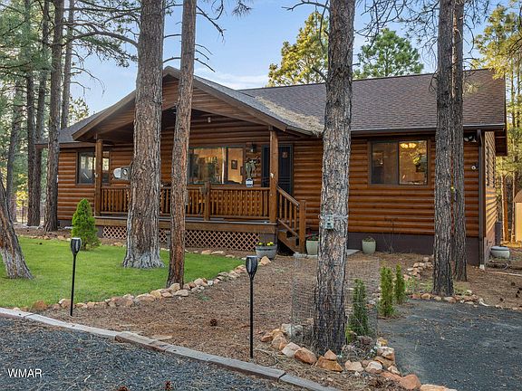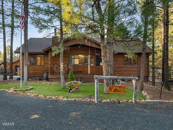 Tucked away within a serene forest, this charming cabin boasts a picturesque setting surrounded by tall pines, offering a tranquil retreat from the hustle and bustle of city life. The furnished interior features a spacious layout with a great room split floorplan, adorned with T&G ceilings and warmed by a cozy wood stove, creating the perfect ambiance for relaxation. The kitchen showcases granite countertops throughout, complemented by carpet and laminate flooring, while the peeled post rails add rustic charm to the cabin's aesthetic. Equipped with a central heating and cooling system, comfort is ensured year-round. Outside, the log sided exterior and circular drive enhance the cabin's appeal, set on a heavily treed cul-de-sac lot for privacy. Additional amenities include a 2-car etc... detached garage and utility storage shed, offering ample space for both vehicles and outdoor gear. This cabin exudes a timeless charm with its cabin exterior look, inviting you to unwind amidst nature's beauty. Call Today!