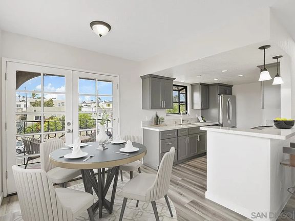 Welcome to this beautifully updated top-floor corner unit in the heart of Golden Hill—one of San Diego’s most desirable and centrally located neighborhoods. This light-filled 2-bedroom, 2-bathroom condo offers 880 square feet of thoughtfully designed living space, perfect for both comfort and convenience. Step inside to find fresh LVP flooring, crisp new paint, and a bright, modern kitchen featuring sleek quartz countertops and a brand-new refrigerator. The bathrooms have been completely remodeled with contemporary finishes for a spa-like feel, and the open living area flows seamlessly through charming French doors to your private balcony—ideal for morning coffee or relaxing evenings with stunning views toward downtown San Diego. Additional highlights include a detached garage for secure parking and storage, laundry hook-ups in unit, low HOA dues, and the unbeatable location: just minutes to Balboa Park, Downtown, South Park, and quick freeway access for easy commuting. Don't miss your chance to own this move-in-ready gem in one of San Diego's most vibrant neighborhoods!