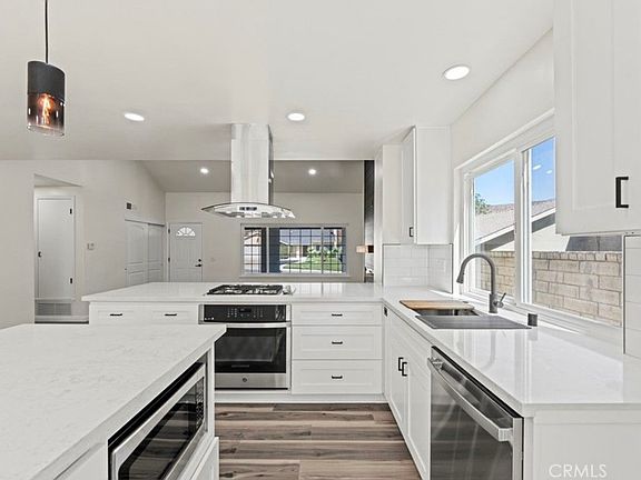 Exuding elegance and modern design, this fully remodeled 4 bed 2 bath 1,750 sq ft residence showcases an inviting open concept layout that seamlessly connects the living room to the chef's kitchen. Upon entry you are greeted by soaring cathedral ceilings and a dramatic floor to ceiling black shiplap fireplace with a rustic wood mantel and sleek electric insert, setting the stage for the home's sophistication. The kitchen offers an abundance of counter space with a large breakfast bar perfect for gatherings, along with quartz countertops, subway tile backsplash, stainless steel appliances, a microwave conveniently placed in the island, and dual pendant lights accenting the designer vent hood and cabinetry. A central flex space with built in desk complements three spacious bedrooms and a guest bath with chic black fixtures, tiled tub shower, and glass enclosure. The expansive primary suite offers abundant natural light, a massive walk in closet, and a spa inspired bath with dual sinks, frameless glass shower, and decorative flooring. With newer roof, plumbing, electrical, dual pane Milgard windows, fresh white exterior paint with black trim and red door, lush newer sod in the front and backyard, a two car garage, and a private backyard with shade bar patio cover, this home combines style and comfort in a prime location near award winning schools, shops, restaurants, and the new Sand Canyon Village all with no HOA and no Mello Roos just off the 14 freeway.