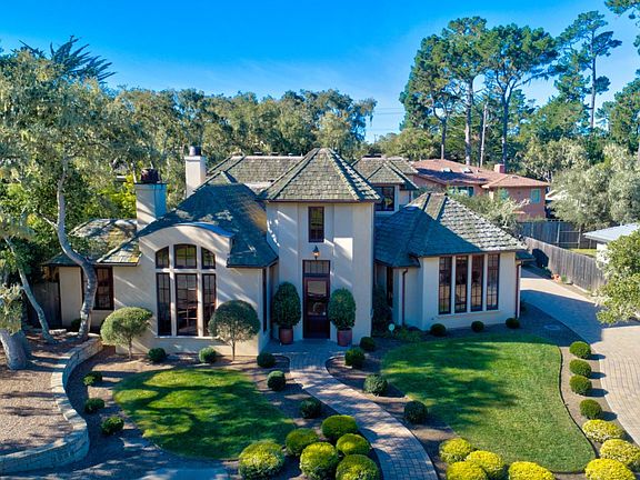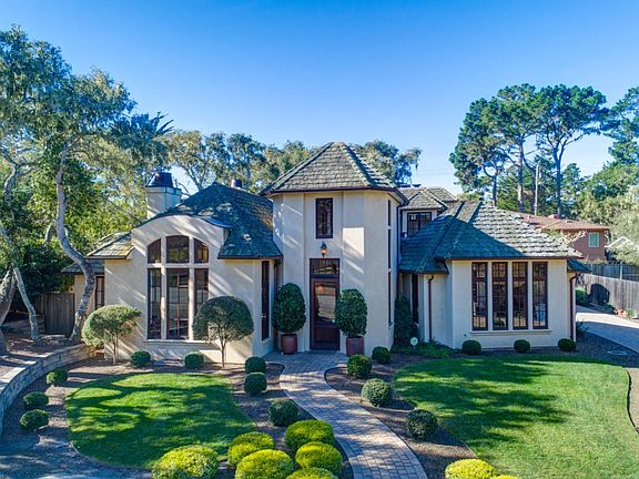 This charming French Country home with 4 bedrooms and serene golf course views, is on a quiet street just one block to Monterey Peninsula Country Club and a short stroll to the beach. Only 12 years old this meticulously crafted and designed home has cathedral ceilings throughout with hand hewn beams, mahogany windows and hardwood and tumbled limestone floors. The gourmet kitchen and luxurious master suite complete this open and airy retreat. The master bedroom and second bedroom/study is on the main floor for the best in single level living.