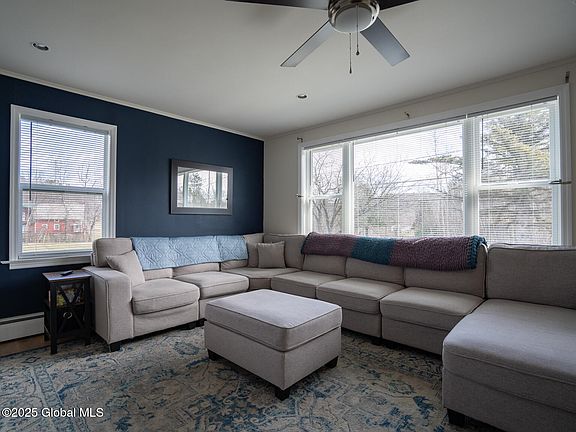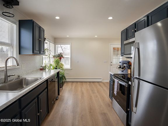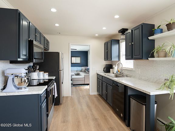 STOP the Scroll, this is the one! Move-in ready! Freshly painted, open layout. Gorgeous updated kitchen w/pantry, stainless steel appliances, new backsplash and countertops. Main bedroom with bold, dramatic focal point wall. Updated windows and doors. Hardwood floors throughout, covered with luxury laminate vinyl for easy care. Updated electrical and siding. Breezeway that will be your VIP lounge for soaking up sunset vibes all summer. Head downstairs and BOOM, tongue and groove wood-finished basement, custom overhead lighting and brand new carpeting too! Double oil tanks to buy in bulk and save. Very large corner lot with fully landscaped yard, side and rear yard for year-round enjoyment. Septic new in 2021, just pumped too. Paved bonus space.