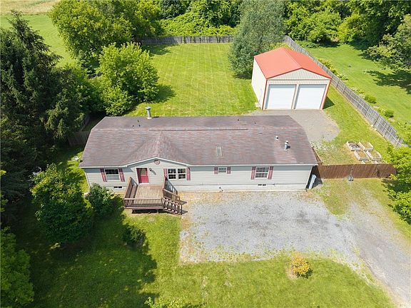Beautiful 3 bedroom 2 full bath ranch (28x68 manufactured home) sits beautifully on just shy of 1 acres. Flooring is engineered hardwoods, freshly painted, coal stove is "as is" Pole barn is 28 wide x 32 deep and 14 feet high (100 amp service in pole barn), loft has additional storage (16x16), fenced in back yard. Located 15 minutes from Canandaigua and Geneva.... beautiful place to be. Home was just professionally cleaned. Listing Agent is related to seller... ALL OFFERS DUE JULY 21, 2025 AT NOON
