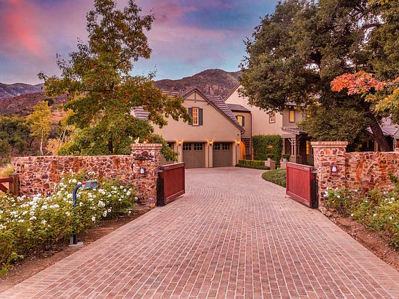 Exquisite estate nestled along the scenic Mulholland Hwy corridor. Atop a view plateau looking over Triunfo creek w/ views into the beautiful Mtns. Quiet, peaceful w/sunrise and sunset views. Privately gated, over 3 acres with gorgeous Oak and Sycamore canopies. Beautiful hardwood throughout lower level, grand entrance, wide hallways w/ soaring ceilings in the living room, shared fireplace between living & office. Fabulous kitchen w/Wolf Range, glass Sub Zero, center island, granite counters, breakfast area & magical views. Formal dining with masterful wine closet and adjacent butler's pantry. The master suite is ridiculous; sitting area, large bath, dual walk-ins, private patio & more smashing views. 3 large secondary en-suite bed and baths and one secondary master retreat with sitting area, kitchen/bar area and private bath. Full laundry room w/sink and 3 car garage plus overflow parking. The yard is magnificent with pool, fountains, built in BBQ and seating bar overlooking the creek, lush landscape and lighting with an abundance of property for play areas, exploration & outdoor fun. Situated within the Las Virgenes school district, minutes from multiple parks, recreation areas, beaches and conveniences. A peaceful lifestyle is beckoning.