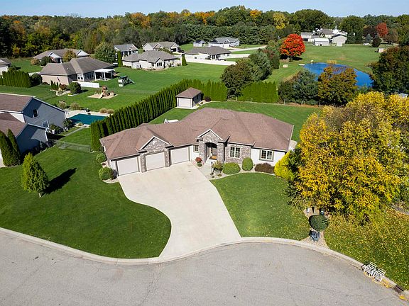 Nestled on a peaceful cul-de-sac, this meticulously maintained ranch offers the perfect blend of comfort, style, & functionality. 1.5 mile from St Joseph Co. This home is packed with upgrades & thoughtful details both inside and out. Car enthusiasts, hobbyists, and those needing ample storage will love the 4+ car garage capacity incl a heated 3+ car attached garage w/convenient rear access, plus detached 12' x 19' garage for lawn equipment or recreational gear. Inside, the open-concept main level is filled with natural light & features vaulted ceilings, quality laminate wood flooring, and a seamless flow throughout the living spaces. The heart of the home is the spacious gourmet kitchen, complete w/maple cabinetry, Whirlpool stainless steel appliances, a large center island w/pendant lighting, & an oversized walk-in pantry. The adjoining dining area easily accommodates large gatherings and offers great views of the private backyard. The primary suite is a peaceful retreat, boasting a tray ceiling w/accent lighting, ceiling fan, a large walk-in closet w/custom organizer, and a private bath featuring a tiled walk-in shower and dual-sink vanity. Main-level highlights include a mudroom that connects to the laundry room w/utility sink, custom cabinetry, folding counter, and nearby half bath for guests. Head down to the fully finished lower level, where entertaining takes center stage. Expansive space features a custom granite bar, Kegerator and tap system, daylight windows, a generous recreation area, a full bathroom, and a private bedroom w/an egress window. Enjoy peace of mind with top-tier systems including a Generac whole-house generator, central vacuum, radon mitigation system, security system, new gas water heater (2024), a Roof Maxx treated roof to extend longevity. Step outside to your very own private backyard oasis, complete w/stamped concrete patio, Hot Springs Grandee hot tub, and arborvitae-lined privacy fencing—an ideal setting for relaxing or entertaining year-round. The fully irrigated and landscaped yard adds charm and low-maintenance curb appeal. This feature-rich ranch home truly offers the perfect balance of elegance, efficiency, and everyday comfort. Buyer to verify dimensions, taxes and schools. Please allow 48 hour response time to any offer.