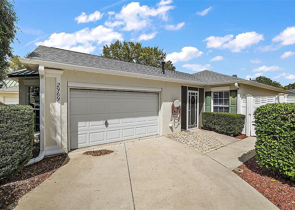 Tremendous location for this bond-paid, stucco "Woodlawn" courtyard villa just minutes to Spanish Springs, Villages Hospital and restaurants and shopping both on Hwy 441 and Hwy 466. The Woodlawn is the preferred 2/2 villa, and this one boasts vaulted ceilings and tile floors throughout! No carpet here! The kitchen is a crowd-pleaser, with granite counters, updated Stainless Steel appliances, a closet panty and a breakfast bar for additional workspace or to bring your guests closer while you entertain. A large living room opens to the guest bedroom which has a custom closet and a custom bath. Further toward the rear of the home you'll find the master suite, complete with a "California-style" custom closet. The surprise in this home is the den, with windowed walls that bring in the light and the beauty of the manicured, private, fenced back yard. Extras include plantation shutters, surround sound speakers, a garage screen and more.