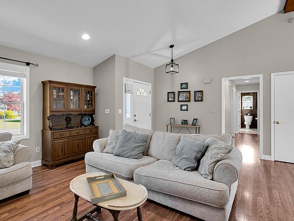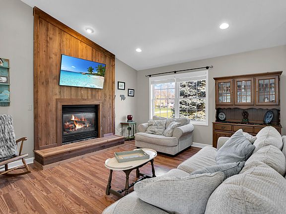 Experience luxury living in this exquisite walkout ranch boasting 4 bedrooms and 3 baths. The large kitchen is a chef's delight with a pantry, stainless steel appliances, and a slider to the expansive deck, perfect for outdoor entertaining. Relax in the family room by the gas fireplace or retreat to the primary bedroom with its walk-in closet and ensuite bath featuring double sinks. Convenience abounds with main floor laundry. The finished walkout basement offers a 4th bedroom, full bath, and a rec room with a wet bar, ideal for hosting guests. Outside, a 12 x 16 storage building with electric provides ample storage or workshop space and an adjacent basketball court. With a new roof in 2023, this home is move-in ready for you to enjoy!