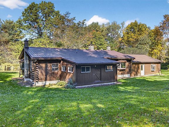 Discover this beautifully maintained ranch-style log home nestled on over eight picturesque acres, offering a tranquil retreat for nature lovers and those seeking comfort in a serene setting. The home features a welcoming covered front porch, an ideal spot to relax with your morning coffee while observing local wildlife in the peaceful surroundings. Inside, the open-concept design seamlessly connects the kitchen, dining area, and living room, creating a spacious atmosphere. The centerpiece of the living room is a huge stone fireplace with a woodstove insert, adding warmth and rustic charm. The custom-built Quaker Maid kitchen is equipped with solid surface countertops. The home includes two bedrooms and a large full bath, ensuring comfortable accommodations. The main floor laundry room leads to a versatile three-season addition, complete with a hot tub. This space offers the potential to be converted into a four-season room for extra living space or an additional bedroom. A spiral staircase descends to the full basement, which houses a coal-burning furnace, shelving units, a workbench, cold storage room, and a pool table! The attached two-car garage is conveniently accessible from the basement, providing ample storage and parking. Enjoy spending time outdoors, surrounded by the lovely natural setting and soothing sounds of nature. The property is conveniently located with easy access to both Ithaca and Cortland, making travel and daily errands simple and efficient. There is an additional oversized, detached 1 car garage providing space for a car and still allowing storage for lawn equipment, etc. Home may be purchased with additional 6.44 acre wooded lot (see MLS #R1643332)
