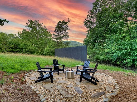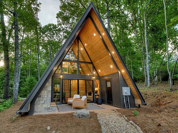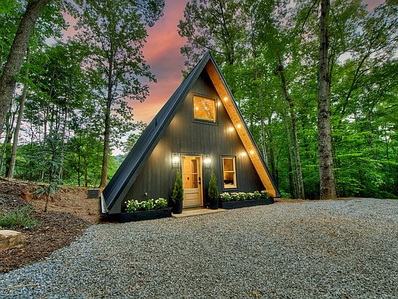 Tucked away in a serene, private setting just minutes from Downtown Blue Ridge, this striking modern-rustic A-frame offers an unparalleled mountain lifestyle. Framed by a lush rolling meadow and accented by soft short-range mountain views, this architectural gem is the epitome of luxury mountain living. Soaring floor-to-ceiling glass walls invite the outdoors in, filling the open-concept living space with natural light and showcasing the beauty of the surrounding landscape. The great room features a seamless flow between the living area, dining space, and a fully equipped kitchen—perfect for entertaining or unwinding fireside after a day of adventure. With one bedroom and a full bath on the main level, and a second picturesque bedroom loft above, the home is fully furnished and and can be sold turnkey-ready with an acceptable offer—ideal for a high-performing short-term rental or a private mountain escape. Step out onto the covered back porch with a gas fireplace for cozy evenings under the stars, or follow the charming pebbled path to your own fire pit nestled in nature's embrace. Home is wired and ready for a hot tub. For the visionary, there is room on the property for a garage, guest house, or additional dwelling to complement the creation completed new. Find yourself immersed in the stars while positioned in your own private North Georgia meadow. A rare offering at an exceptional value, this A-frame retreat is your gateway to the tranquil luxury of North Georgia mountain living. **Rental estimates of $60-70k annually.** Inquire for more information!