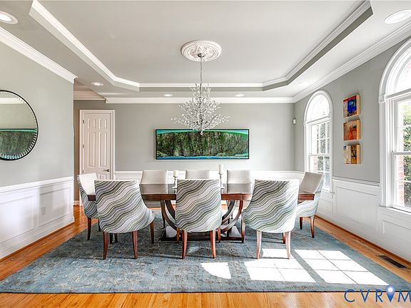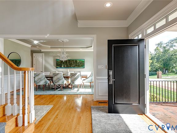 Welcome to this stately brick Colonial set on over 5 acres of professionally landscaped, private grounds in the gated community of Pembroke Farms. Enjoy exclusive neighborhood access to a wide, navigable stretch of the James River conveniently located on the River Road Corridor. Spanning three finished levels, this home offers 5 bedrooms, numerous formal and informal living spaces and multiple flex rooms that could serve a variety of purposes. The thoughtfully designed interior includes a first floor with 10 ft ceilings, a formal living and dining room, an office, a sitting room enveloped by windows, and a large family room that seamlessly opens to the renovated gourmet kitchen with quartz countertops, marble backsplash, custom cabinetry, and top-tier appliances. A butler’s pantry/drop zone connects to the attached garage for everyday convenience. Upstairs, the primary suite is a private retreat with a spa-inspired en suite bath, a dressing room, and a custom walk-in closet. Three spacious bedrooms complete the second floor, each with walk-in closets, and two featuring en suite baths. The lower level has a rec room with projector, a kitchenette with bar style seating, and a wine cellar—perfect for entertaining. Additionally, there is another kitchenette, one bedroom and full bath, two flex rooms as well as ample storage closets. This exceptional home offers an 8-bay garage, 4 bays attached and 4 bays detached. The detached 4 bay garage includes car lifts and over 900 sq. ft. of unfinished space—already roughed in for a bath—ideal for a future guest suite or studio. The outdoor living space is equally impressive with a multi-tiered travertine terrace, complete with a grilling station, space heaters, and a striking stone fireplace, all overlooking serene, manicured grounds. A rare offering of craftsmanship, privacy, and luxury in one of Richmond’s most sought-after riverfront enclaves.