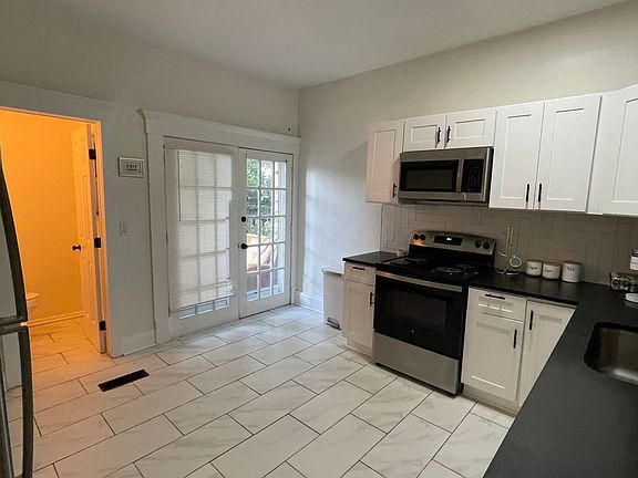 Modern Kitchen: Recently renovated with white cabinetry, stainless steel appliances, sleek countertops, and tile flooring.