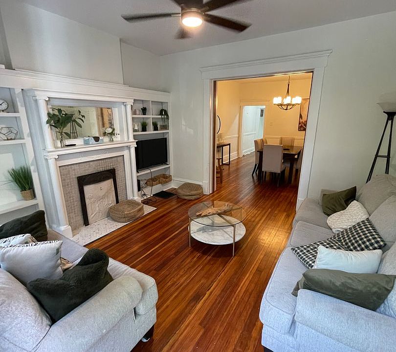 Spacious Living Areas: Enjoy a bright living room with hardwood floors, large windows, and a decorative fireplace with built-in shelving.