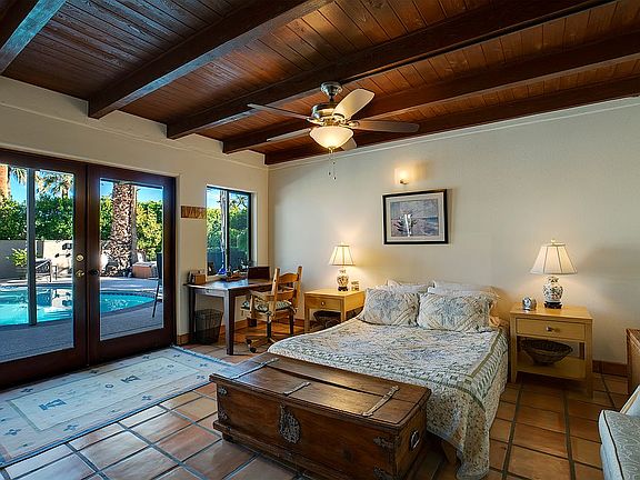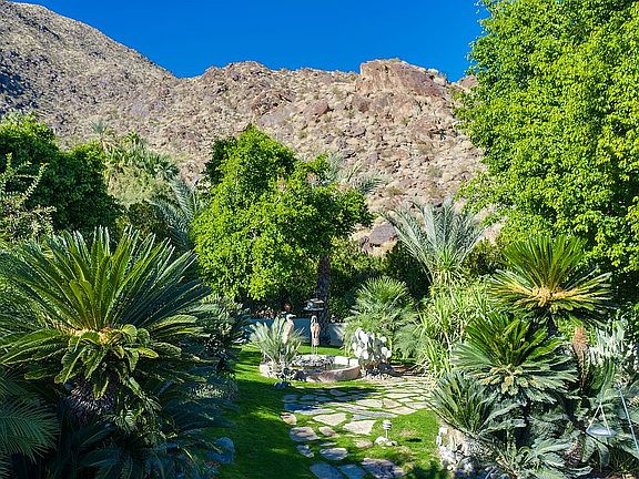 The magic of Palm Springs at its best on this 0.45 acres lushly landscaped land, with mature fruit trees, date palms, fountain & numerous areas ideal for entertainment. Just a few minutes from Downtown Palm Springs, this unique, tranquil, hillside retreat if full of privacy & personality. Stunning gardens offer an escape & superb west mountain views from the front courtyard gas fire pit. Beautiful cedar, tongue-groove ceilings with exposed rafters & new Italian tiles. The expansive living room boasts a bar area & a beautiful tiled fireplace. The formal dining area overlooks the back yard featuring a large salt-water heated pool, spa, koi ponds with waterfall & majestic views as well. The new custom-made kitchen features stainless steel Thermador appliances, gas range, double ovens & Ceasar stone countertops & backsplash. This home further features a newly remodeled Casita equipped with kitchen & private bathroom. Other upgrades include new pool equipment, new pool (new plaster & concrete). Additionally, the home features new irrigation valves, two new bathrooms, new electrical, new 200 Amps electric panel, copper water lines re-piping throughout & 3 high efficiency HVAC units.
