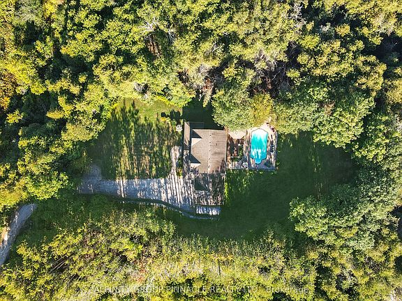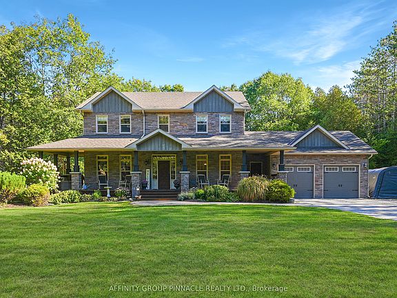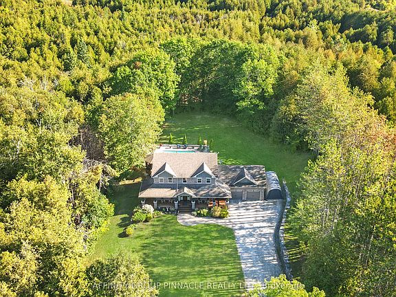 Tucked away in a serene forest with a winding driveway that leads to sprawling over 2500 sq ft custom home on a 4 ACRE Lot. This property is secluded, surrounded by towering trees and away from the hustle. The character of the home garners attention with the stone exterior, covered front porch and beautifully landscaped yard. This property is ideal for entertaining with features like the scenic pool, covered hot tub, massive deck, all contributing to a backyard oasis. The home has an attached 2-car garage plus extra storage onsite. Enter the home and notice the elegant kitchen with high-end S/S appliances, tons of cabinet space, pantries, and open concept dining. Wander into the cozy living room and enjoy the classic stone fireplace. In total, this house has 3 bedrooms and three bathrooms. The primary B/R includes an ensuite with a luxury tile shower and soaker tub. The basement is already framed with high ceilings ready for completion. Check out the spacious mudroom with garage access. Quiet country properties like this are rare to find! And only stones throw away from the local bakery and elementary school. 15 min to Lindsay / 15 min to Peterborough. This property is private, elegant and undoubtedly sets itself apart from other rural homes.