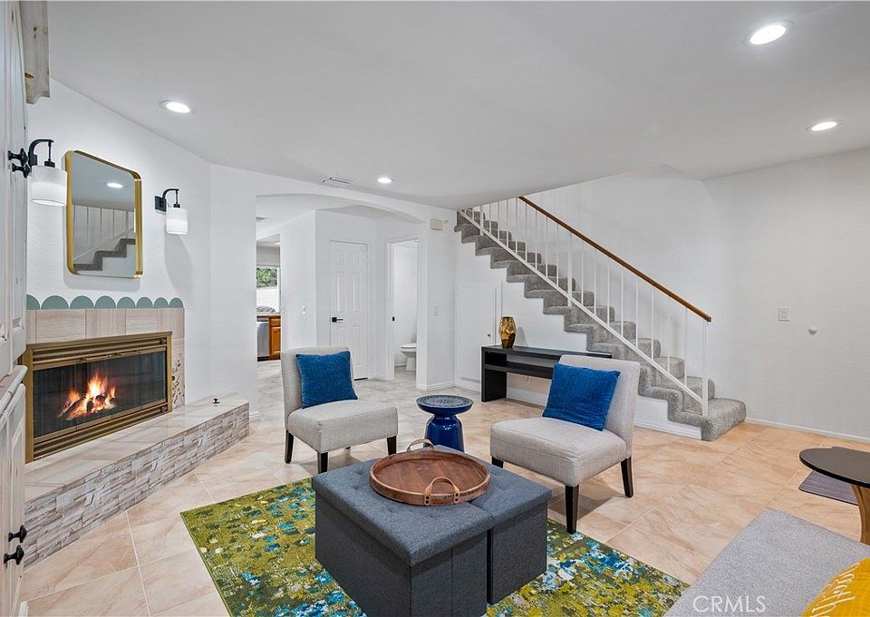 The main level features an airy living area with a cozy fireplace, porcelain tile floors, and seamless access to the largest private patio in the community, perfect for outdoor dining or weekend gatherings. The remodeled kitchen is equipped with new brushed stainless steel appliances, granite countertops, and a wine cooler, creating a space as functional as it is stylish.