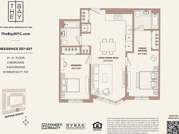 At The Bay, our two-bedroom apartments are designed for families and couples embracing new beginnings. These thoughtfully crafted homes balance luxury with functionality, offering ample space to grow and thrive in vibrant Coney Island. Kid-Friendly Amenities: Families will appreciate the dedicated outdoor play area and the indoor playroom, perfect for keeping little ones active and engaged year-round. Work and Relaxation Combined: Stay productive with the co-working lounge, featuring private office pods and high-speed Wi-Fi, and unwind on the rooftop lounge, complete with BBQ grills, cabanas, and panoramic views. Active Living: Maintain a healthy lifestyle with access to the state-of-the-art fitness center, Olympic-sized heated saltwater pool, and regulation pickleball court. Elegant Interiors: Scavolini Italian kitchens with high-end appliances, triple-glazed windows, and spa-inspired bathrooms with deep soaking tubs ensure every moment at home is luxurious. Smart and Spacious: In-unit washer/dryers, Wi-Fi smart locks, and custom modular closets offer unparalleled convenience for busy families. Nestled at 2971 Shell Rd, The Bay places you close to Coney Island's iconic boardwalk, top schools, and public transit, offering the perfect balance of excitement and ease. Whether you're working, playing, or simply enjoying time with your loved ones, The Bay is where life's next chapter begins. Welcome home. Required Fees: Application Fee: $20 per applicant. One Month Rent: Due at signing. One Month Security Deposit: Due at signing (Refundable) Utility Fees: All tenants are responsible for setting up a ConEd account prior to signing and for the associated utility fees based on usage Optional Fees: Please inquire about our pricing and fees related to our optional services including access to the Amenity spaces, Parking, Bike Storage, and tenant storage. *Photos may not be of actual unit but are meant for representational purposes only.