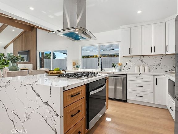 Spectacularly remodeled single-level home on a quiet single-loaded cul-de-sac offers breathtaking mountain and city light views and is completely move-in ready! From the moment you enter through the gated courtyard, you’ll appreciate the quality and attention to detail throughout this beautiful home. The light and bright kitchen features new Quartz counters, new soft-close wood cabinets, new stainless steel appliances, and a spacious waterfall island with cooktop, microwave and bar seating. The adjacent dining area flows seamlessly into the great room with wood beam ceilings, recessed lighting, and a cozy fireplace. The primary suite offers a private patio and a gorgeous remodeled bathroom with Quartz counters, dual sinks and a walk-in shower. Each secondary bedroom has its own fully remodeled bathroom and views of the lush backyard. Indoor laundry room includes brand new washer and dryer and home has direct access to the 2 car garage. Additional upgrades include new COREtec luxury vinyl plank flooring, new windows, new solid wood doors, fresh paint, new AC, and a new tankless water heater. The expansive 7,155 sq ft lot provides exceptional privacy, a lush grassy lawn, two patio areas, and sweeping panoramic views. Located within walking distance to the community pool, pickleball courts, volleyball, basketball, and playground. Just minutes to the beach and harbor, close to excellent schools, and low tax rate — this is the perfect place to call home!