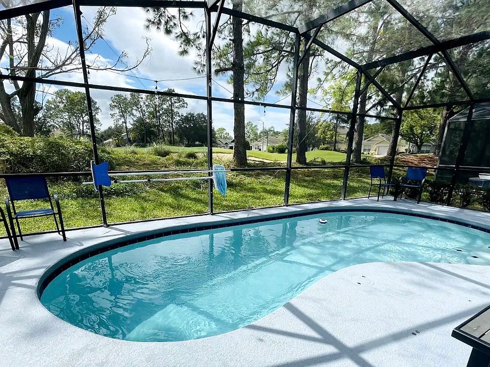 Fully furnished 3-bedroom home with golf course views, a private heated pool, and professional pool maintenance included. This updated property is located in the gated Southern Dunes Golf & Country Club community and features an open layout with a renovated full-size kitchen, spacious dining area overlooking the greens, and a comfortable living room with a 65" Samsung Smart TV. The master bedroom includes a king bed, walk-in closet, and private bathroom. Additional highlights include smart TVs in every bedroom, a full-size washer and dryer, garage and driveway parking, and central access to shopping, dining, Disney, Legoland, and more.
