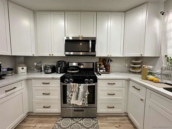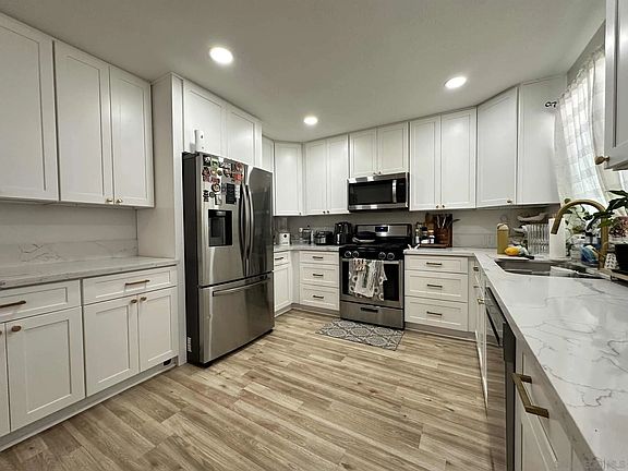 Quartz countertopsStainless steel appliancesPlenty of natural lightWhite cabinetsCovered patioModern kitchenLow-maintenance front landscaping