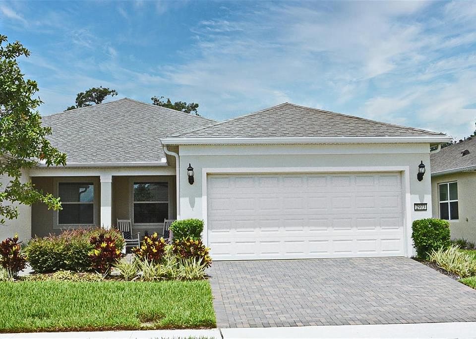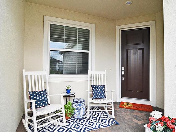 Why wait to build? The owner spared no expense on upgrading this Villa located in the desirable 55+ community of Del Webb Sunbridge just a few minutes from Lake Nona and downtown Saint Cloud. The 2 bedroom/2 bathroom /Villa features many upgrades like Hunter Douglas Nantucket single panel shades, Hunter Douglas Vertiglide at the sliding glass doors, and gorgeous white upgraded 42" inch tall kitchen cabinets. Stainless steel appliances, quartz countertops, a large island, and natural gas cooking will have you feeling like a chef in your home! All the Whirlpool appliances are included. The luxurious owner suite has an upgraded tile walk-in master shower with a bench seat, frameless glass door, double sinks, white cabinets, quartz countertops. and a large walk-in closet. The Flex room/Den features sliding barn doors for privacy with a built-in custom-by-design twin wall bed for extra company, and is currently used as an office. For additional storage, the seller had a custom-built cabinet installed as you enter from the garage. The mature trees behind the backyard provide plenty of shade from the afternoon sun but allow a beautiful view of the sunset. The patio is pre-plumbed for an outdoor kitchen. The garage floor has an Epoxy Hybrid coating. You enter the guarded gatehouse, driving alongside gorgeous, landscaped walking trails to our world-class 27000 sqft amenity center. Take a dip in the resort-style zero-entry pool, exercise in the resistance pool or enjoy the jacuzzi. Play pickleball or tennis at the sports courts. Participate in one of our many sports classes or work out in the state-of-the-art fitness center. Meet the neighbors at the tavern for happy hour or enjoy a nice meal on the patio. The Clubhouse offers a large theatre and multiple studios for arts and crafts. Let your dogs play at the state-of-the-art dog park. The choices are endless! All the amenities and all outdoor maintenance including internet and termite bond are included.