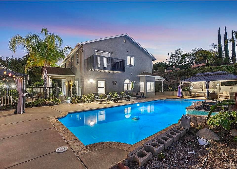 Welcome to your own slice of paradise in beautiful Valley Center! This elegant, fully remodeled home sits on 4.15 acres of usable land with breathtaking mountain views, a sparkling pool, two spas, and multiple outdoor areas designed for entertaining, relaxing, and truly enjoying Southern California living.  A long, gated driveway leads you to this private retreat, setting the tone with elegance and tranquility from the moment you arrive. Step inside and experience the vaulted ceilings, graceful arches, and natural light that fills every room, creating a warm yet grand atmosphere. The home also features a newer A/C system and a layout that flows effortlessly from room to room. The huge kitchen is a showstopper fully updated with quartz countertops, backsplash, lighting with top of the line appliances and opens to a spacious family room with a fireplace and picture-perfect views. You’ll also enjoy formal living and dining rooms plus a cozy breakfast nook overlooking the property. Outside is an entertainer’s dream, with your own backyard oasis with a built-in BBQ, gazebos for outdoor dining, and a patio with panoramic views that set the stage for unforgettable gatherings. The expansive pool and two spas create a true resort-style experience right at home. The primary suite is a true retreat featuring a private balcony with sweeping views, his-and-hers closets, and a spa-like bathroom with a soaking tub and stand-up shower. A Jack & Jill bathroom conveniently connects the two additional upstairs bedrooms, while the open loft makes the perfect home office or creative space. The land is exceptional elevated for views yet flat and usable for horses, gardening, or future expansion, complete with a mini-corral for small animals. This Valley Center gem truly has it all.