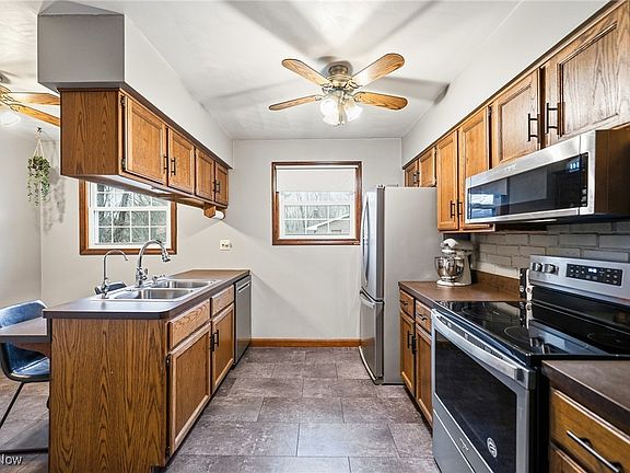Welcome to 2974 Schotten Rd., a well-maintained bi-level home located in Hubbard Township within the Hubbard School District, offering space, functionality, and recent updates throughout. This property features a rare 4-car garage setup with two attached and two detached bays, perfect for vehicles, storage, or hobby space. The inviting front porch leads into a welcoming foyer that opens to a bright vaulted-ceiling living room with comfortable carpeting. The living area flows seamlessly into the dining space, creating an ideal layout for everyday living and entertaining. The kitchen, while a separate space, remains well connected and offers wood cabinetry, laminate countertops, stainless steel appliances, and a breakfast peninsula providing additional seating for an eat-in option. The upper level includes two generously sized bedrooms, both featuring newer carpet and double closets, along with a full bathroom complete with a stylish vanity, tub, and tiled walls. The lower level expands the living space with two additional bedrooms, also offering newer carpet and double closets, plus a second full bathroom featuring a tub surround and vinyl plank flooring. A dedicated laundry and storage area adds convenience and functionality. Major updates include a dimensional shingle roof (2020), vinyl windows (2015), and a new septic system (2025). Additional features include a 200-amp electrical panel, 80-gallon hot water tank, Kinetico water treatment system, and reverse osmosis for enhanced water quality. This property delivers a thoughtful layout, key mechanical upgrades, and ample garage space, all in a desirable location. A great opportunity to own a solid, move-in-ready home with room to grow.