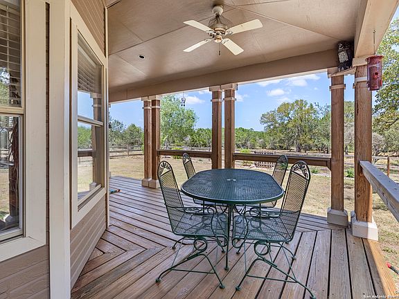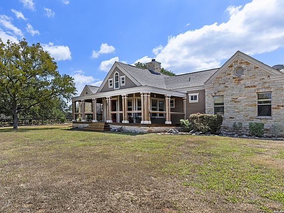 Welcome to this serene Hill Country ranch-style home, nestled on a peaceful 5.33-acre estate in New Braunfels, and with no HOA. Thoughtfully positioned at the center of the lot, this single-story, 3-bedroom, 2-bathroom home offers 2,087 square feet of bright, open living space surrounded by nature - the perfect blend of comfort, privacy, and rural charm. Step inside and you'll immediately notice the abundance of natural light pouring through panoramic double-pane windows in every room - offering stunning 360 views of the property. The spacious living room is warm and welcoming, with a vaulted ceiling, engineered hardwood floors and a striking stone fireplace that anchors the space. The island kitchen includes Vicostone Quartz counters, eat-in dining area, and views of the backyard, while the primary suite is a private retreat - featuring patio access, vaulted ceilings, a walk-in closet, and an ensuite bath with dual vanity areas and a recently updated walk-in shower. Two additional bedrooms, a walk-in pantry, laundry room, and storage area complete the layout, all with abundant windows and views of the outdoors. Outside, enjoy the wraparound front porch and covered back patio, or take a moment to relax on the secluded stone sitting area, tucked under a massive oak tree - a beautiful place to gather and relax with family and friends. The one-acre homestead includes both the 1/2-acre (.2 mile) chip-sealed driveway and the 1/2-acre fenced home site, which is beautifully landscaped with native plants and mature trees. The remaining 4.33 acres consist of open pasture currently leased to a neighboring rancher for grazing their longhorn cattle and mules - allowing you to maintain the agricultural exemption on that portion of the land and benefit from reduced property taxes. Nature lovers will appreciate frequent visits from deer, foxes, wild turkeys, rabbits, roadrunners, and even peacocks. In spring, the landscape comes alive with wildflowers, and sunsets here are nothing short of magical. Additional exterior features include: detached 2-car carport with large storage rooms on either side, workshop shed with electricity, expanded garden shed & well house, LED lighting, new attic storage above carport, private well and septic system, and chip-and-seal driveway (approx. 0.2 mi) with dual electronic gates for added privacy and convenience. While this home feels like a true countryside escape, you're just minutes away from retail, restaurants, grocery stores, medical facilities, and entertainment. It's the best of both worlds - peaceful and secluded, yet close to everything you need.