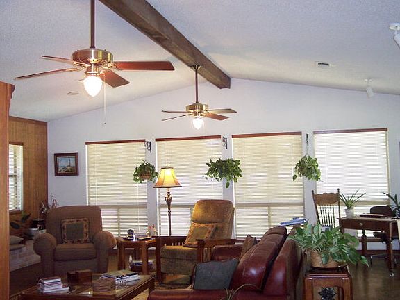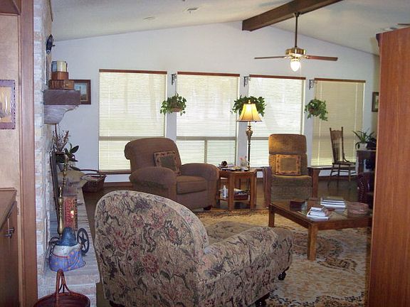 HILLSIDE VIEWS & YOUR OWN SECRET GARDENS await you. Set among the mature oaks, this one owner home is built for easy living & great views. Large rooms, abundance of built ins, closets & storage. Saltillo & vinyl tile flooring thruout this fine home. Oversized brick FP w/ heatalator in large great room surrounded by windows to enjoy the view in every direction or step outside to the double decks, inground pool, guest house & gardens. 1200 sq ft barn, tack rm, horse stalls, workshop, hay loft, Water to 1200 sq ft barn, workshop, covered carport & double garage, well depth appx 380'.
