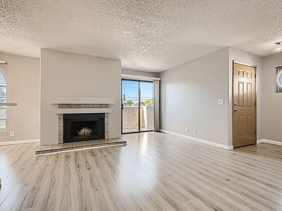This 889 sq. ft. unit features an open floor plan with wood laminate flooring in the main living area, a cozy gas fireplace, ceiling fan with light, and window and door blinds throughout. The kitchen includes a breakfast bar, laminate countertops, and all brand-new appliances.