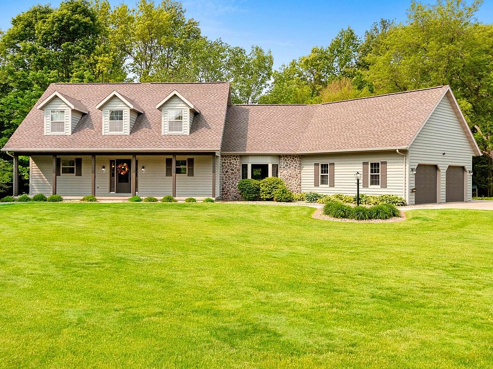 What a fun find! 3+ bedroom, 3.5 bath walk out 2 story with large open front porch and large back deck overlooking nature. Enchanting great room with half logs, wood stove, patio doors to deck. Oak cabinetry in kitchen and semi formal dining/office with backyard views. First floor primary suite with full bath/soaking tub and separate shower, double sink vanity. 2 more generous bedrooms upstairs and oversized full bath. Hardwood floors on first floor. Walk out lower level with gas fireplace, and dry bar, guest bedroom space/or multi-purpose areas and full bath. Heated 3 stall tandem garage with pellet stove, shelving, built in cabinets, workbench. Side gravel space for camper/and or boat parking.