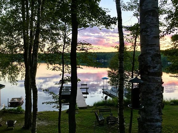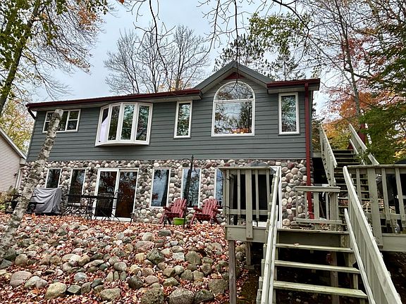 Welcome to Your Lakefront Retreat! Enjoy lakeside living at its finest with this beautiful 3 BR 2 BA home offering 50 feet of pristine, sandy frontage on full-recreational Trump Lake. Designed for comfort and relaxation, the main level features stunning tongue-and-groove cathedral ceilings, a bright den with a charming bay window, a spacious family room highlighted by tall ceilings, 3 bedrooms, and a cozy free-standing gas fireplace—perfect for gathering with family and friends. The fully finished lower level expands your living space with an open-concept kitchen and living area, a full bath featuring a gorgeous tiled shower, and an efficient in-floor heating system. Step outside to enjoy a wrap-around deck overlooking the lake, perfect for entertaining and taking in beautiful sunsets. The property includes 2 storage sheds, dock, blacktop driveway, and is located on the ATV/snowmobile trail. Furnishings are negotiable, making the home move-in ready. Call today!