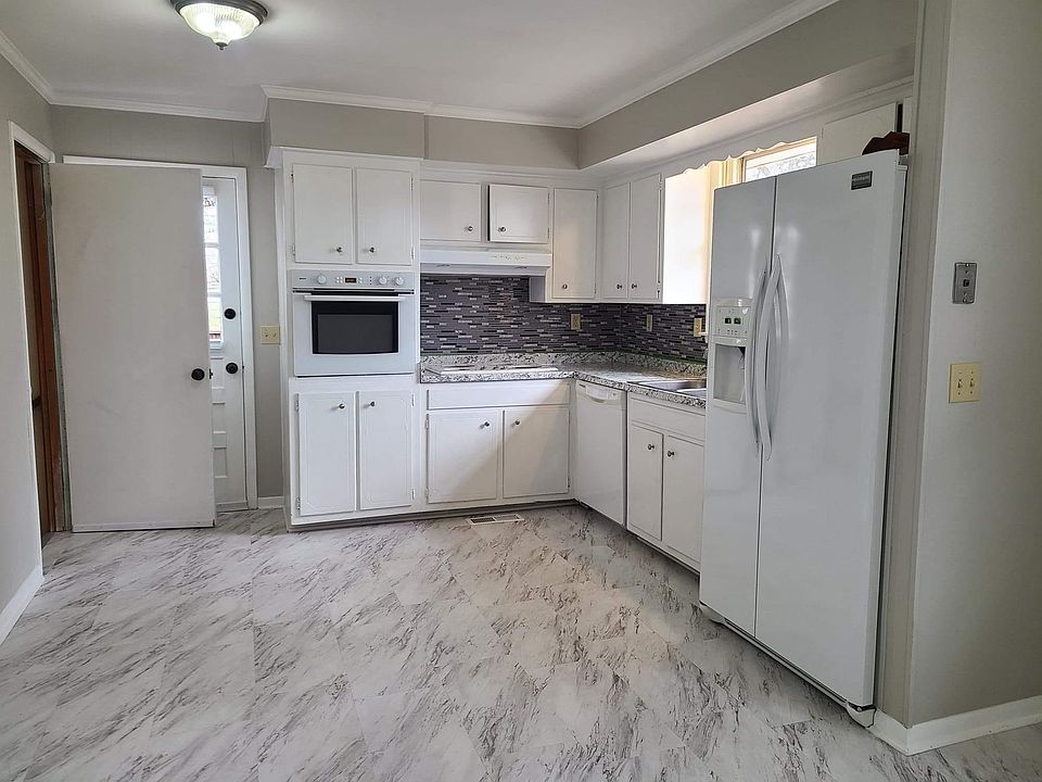 Freshly renovated three bedroom, two bath upstairs with a finished basement area downstairs and a two-car garage with laundry connections and whole house water filtration system. Smart lock entry, large connected patio deck, and fenced-in back yard, upsized main water line for reduced pressure drop during heavy use, bright outdoor flood lights all around for security, full kitchen with full size refrigerator and TONS of storage! Large yard and concrete driveway less than a mile from Starbucks, chick-fil-a, and Home Depot!